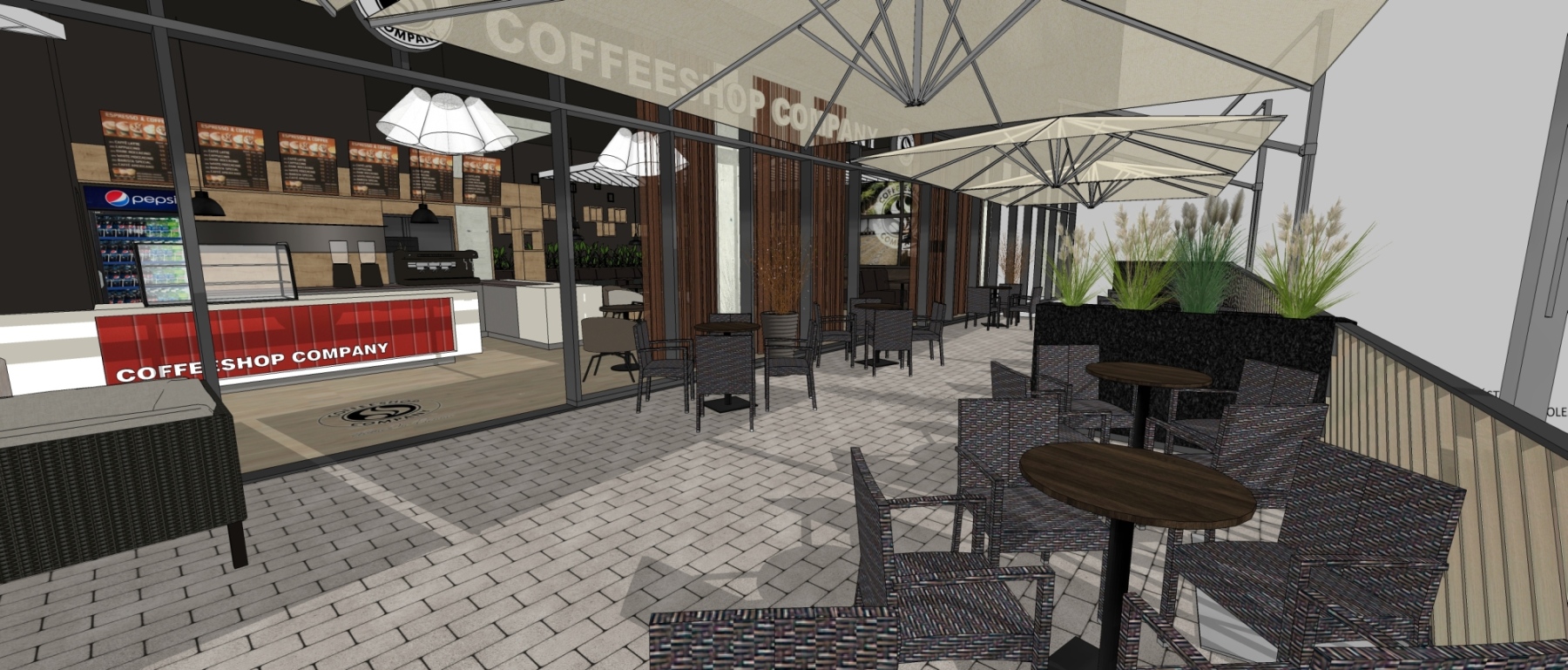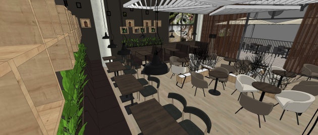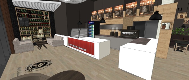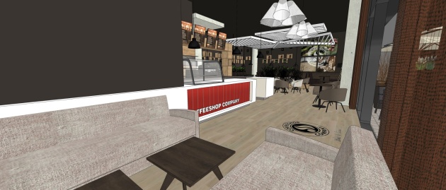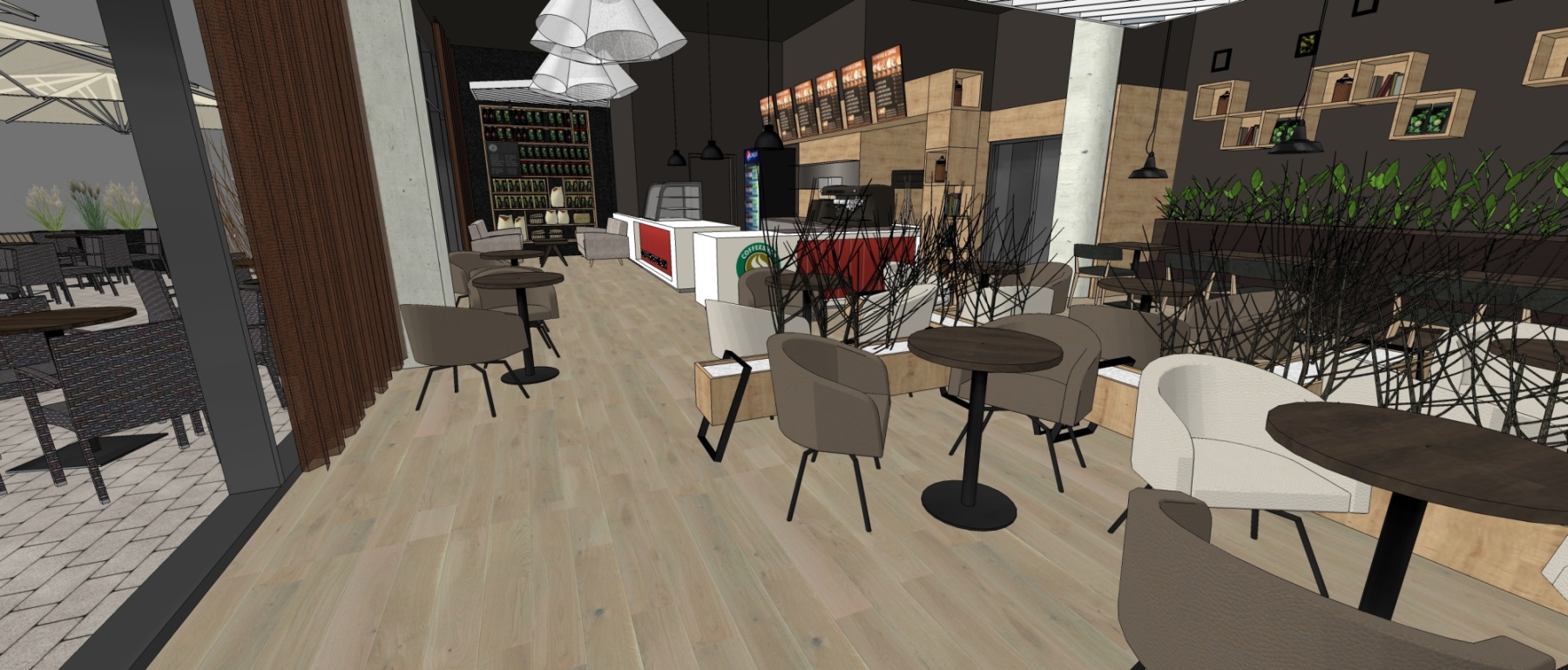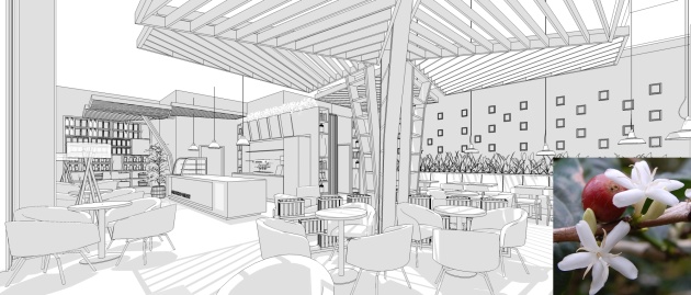 Hlavnou ideou kaviarne je biela podhľadová konštrukcia, ktorá má pripomínať kvet kávovníka. Steny a strop budú tmavé, stĺpy s priznaným betónom, nábytok obmedzený na dva drevené dekory a béžovo-červený pult z umelého kameňa. Ako doplnky budú použité živé rastliny a marketingové materiály. V najbližšej letnej sezóne prídem na espresso a sadnem si na terasu, ktorá sezónne interiér rozširuje von z budovy.
