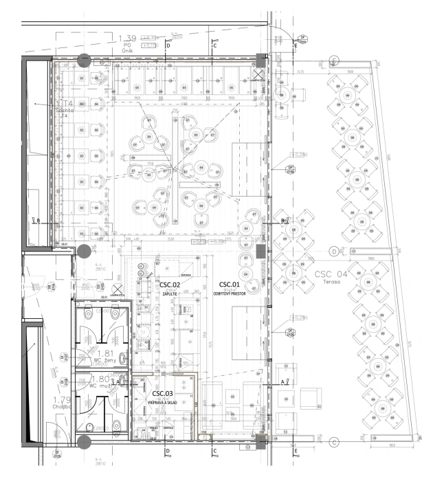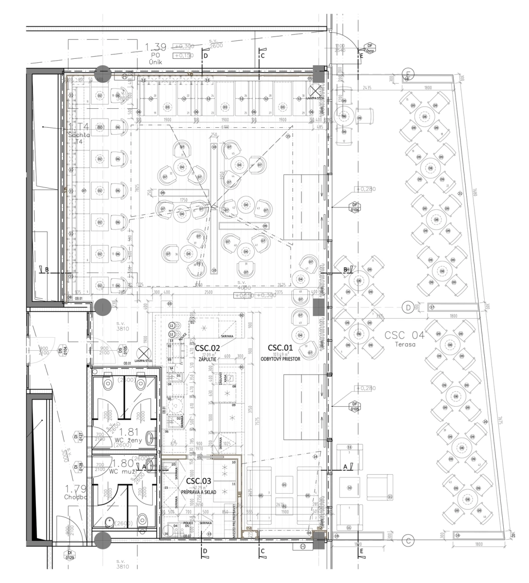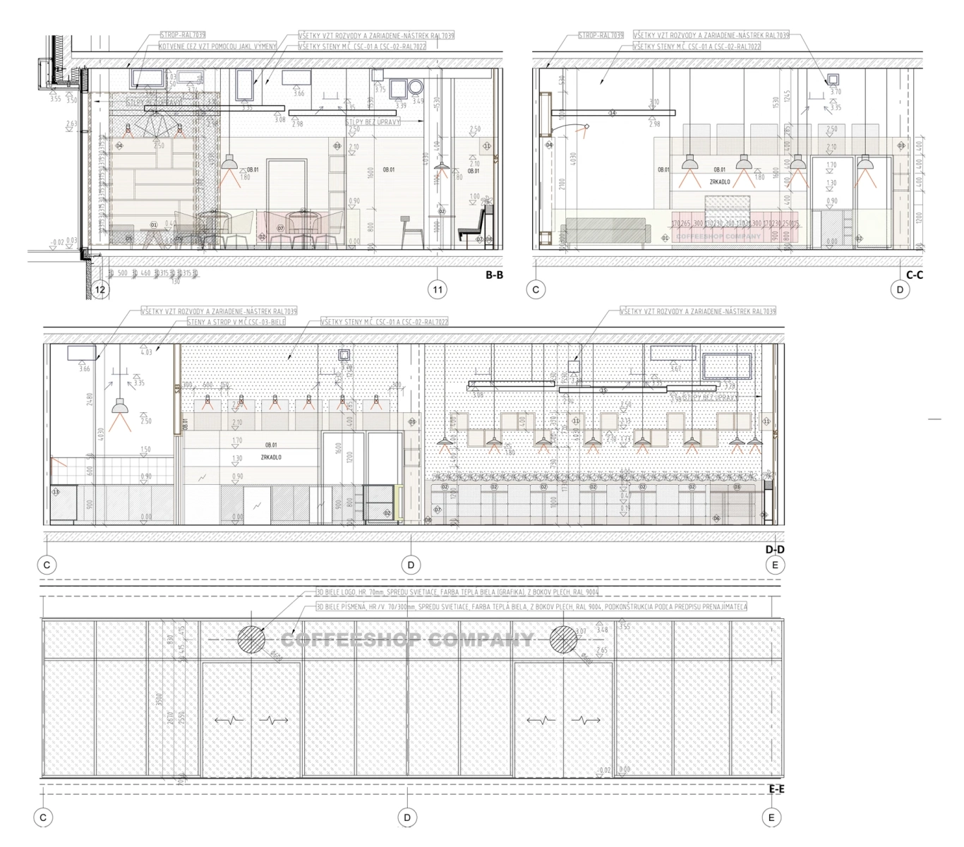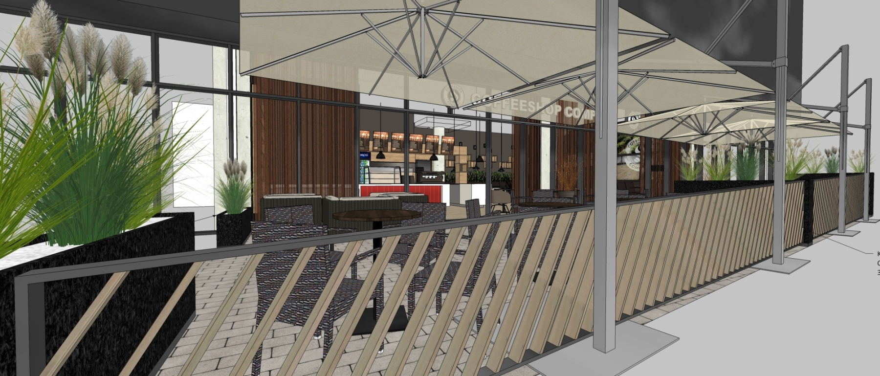 Hlavnou ideou kaviarne je biela podhľadová konštrukcia, ktorá má pripomínať kvet kávovníka. Steny a strop budú tmavé, stĺpy s priznaným betónom, nábytok obmedzený na dva drevené dekory a béžovo-červený pult z umelého kameňa. Ako doplnky budú použité živé rastliny a marketingové materiály. V najbližšej letnej sezóne prídem na espresso a sadnem si na terasu, ktorá sezónne interiér rozširuje von z budovy.