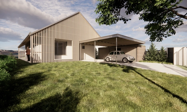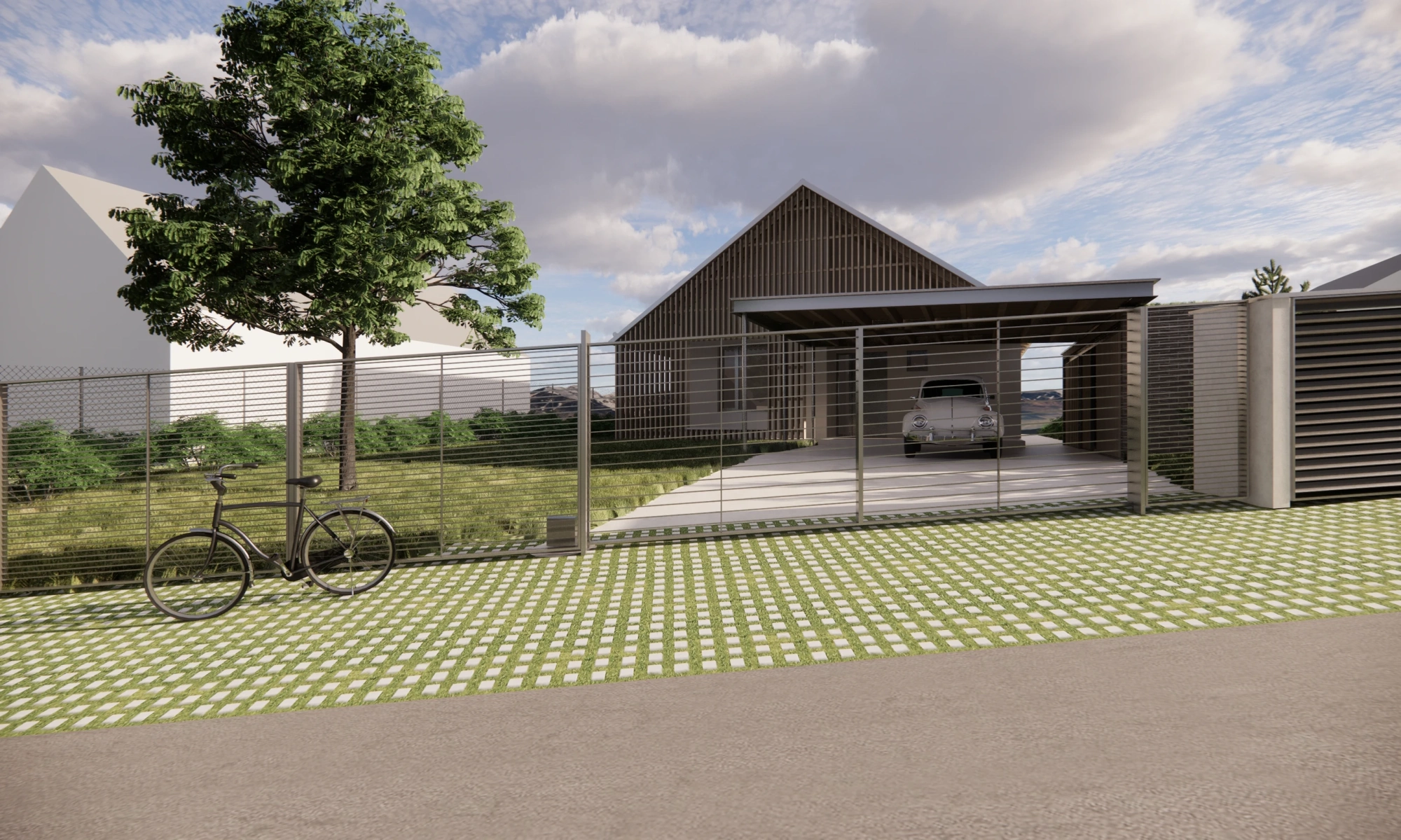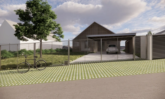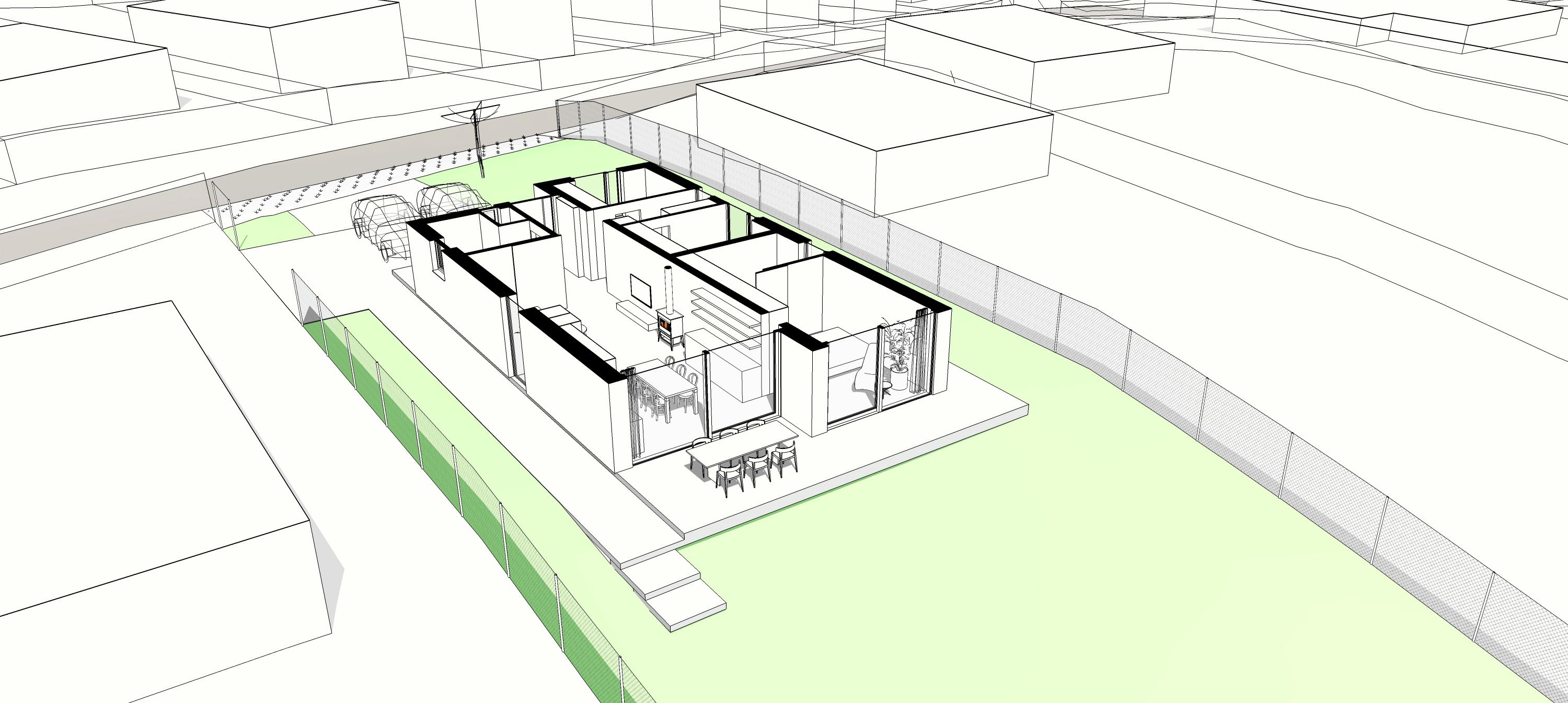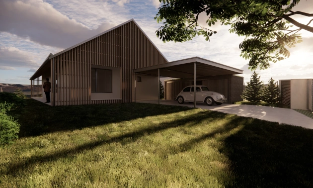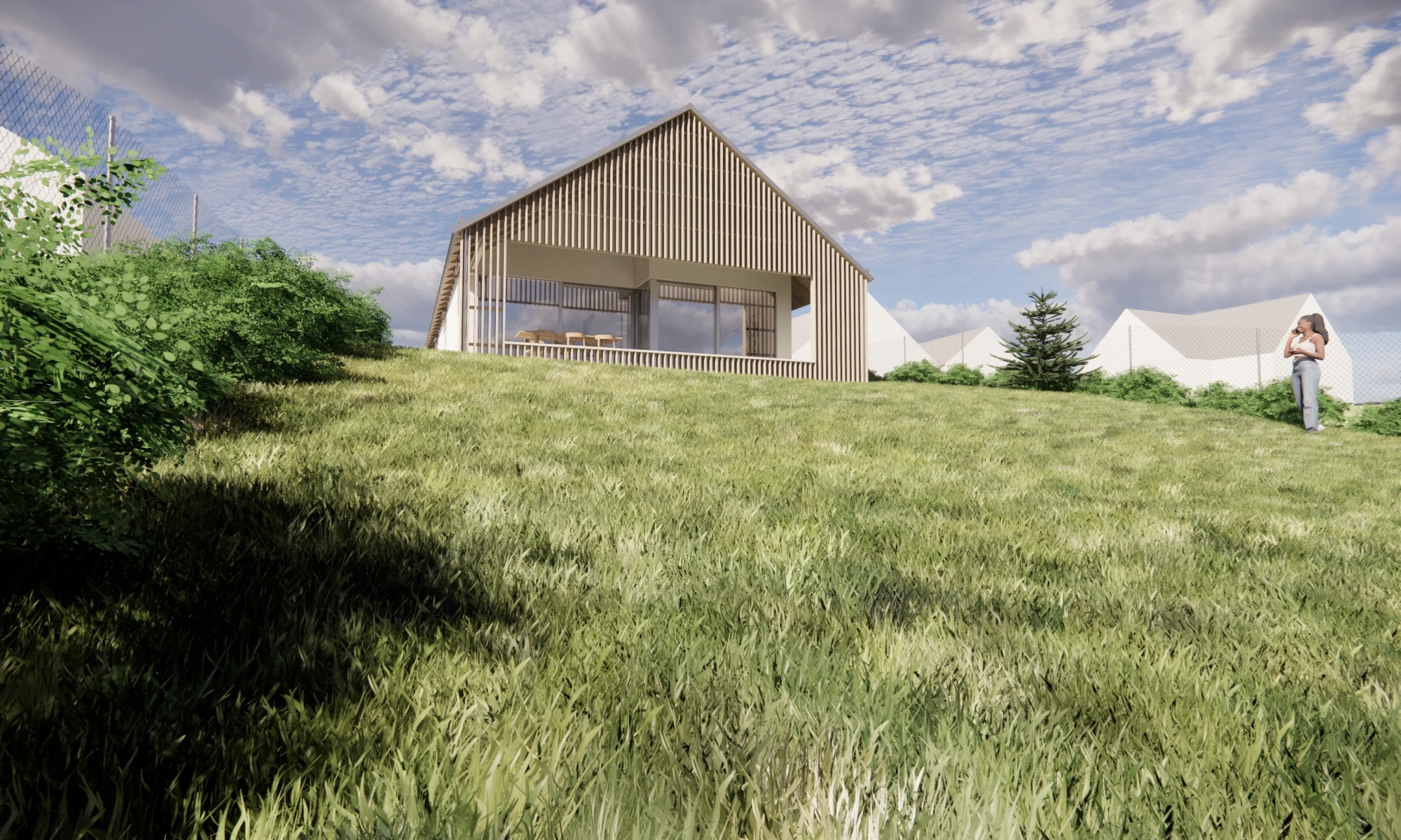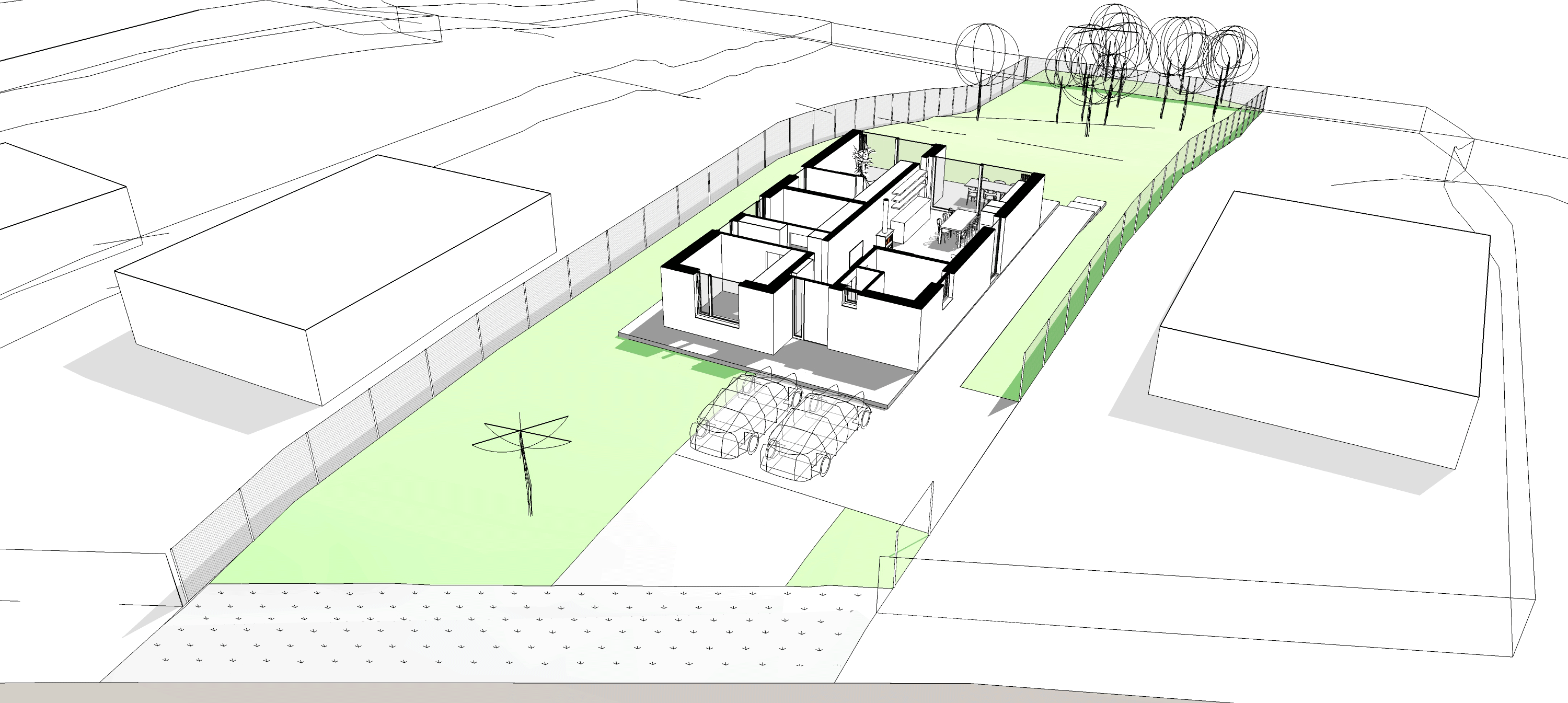Zámerom štúdie je novostavba jednopodlažného domu na vrchole svahovitého pozemku, ktorý má slúžiť štvorčlennej rodine. Okrem domu bude na pozemku riešené prekryté parkovanie pre dve osobné vozidlá a dielňa so skladom a odstavnými plochami pre bicykle, motorku.