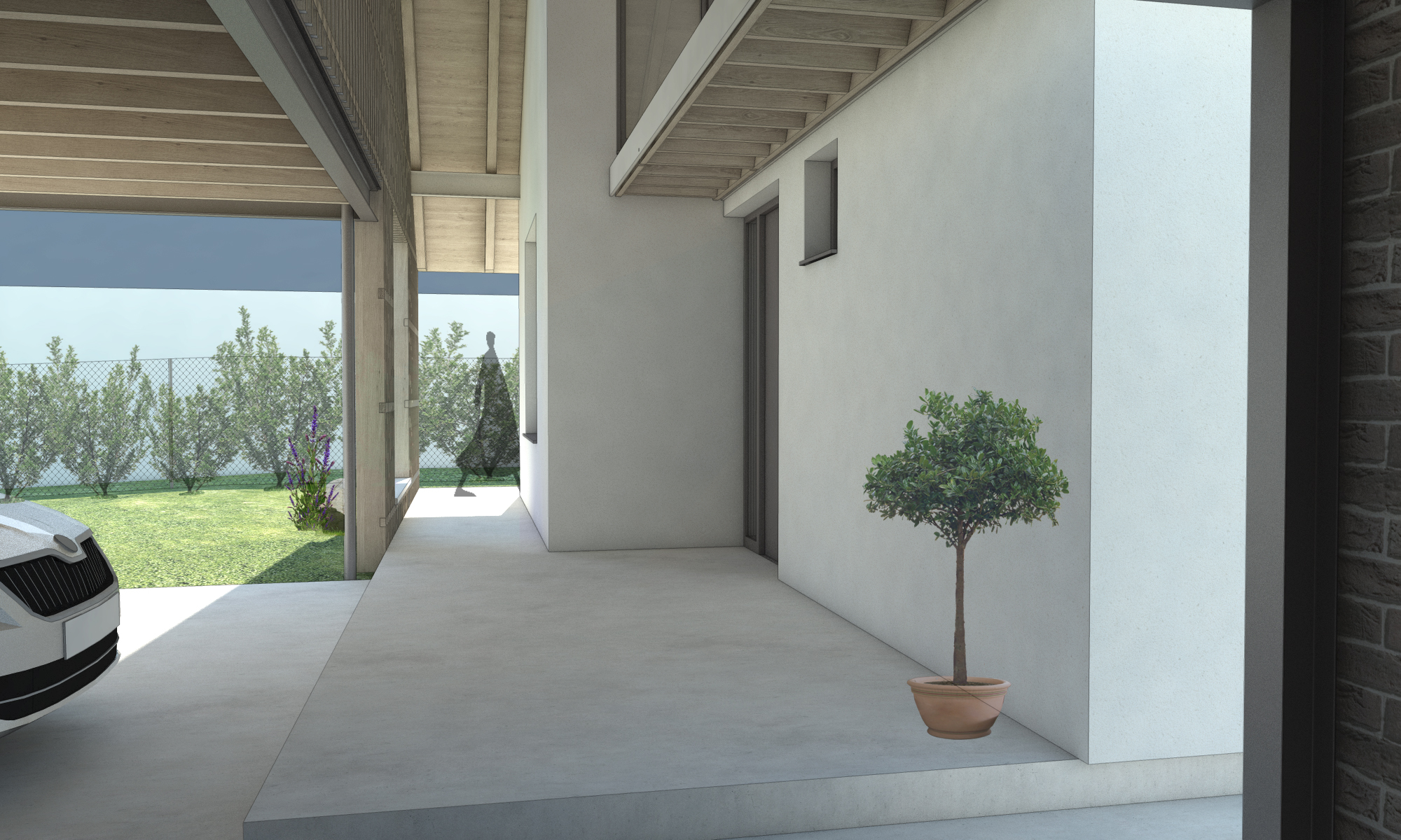 Spevnené plochy na pozemku sú riešené minimálne pre potreby, príjazdu vozidiel a parkovania, vytvorenia závetria a obslužnej komunikácie zo západnej strany domu, krytej obytná terasy z juhu a komunikácie z východnej a severnej strany, ktorá má charakter verandy prístupnej zo súkromnej časti domu.