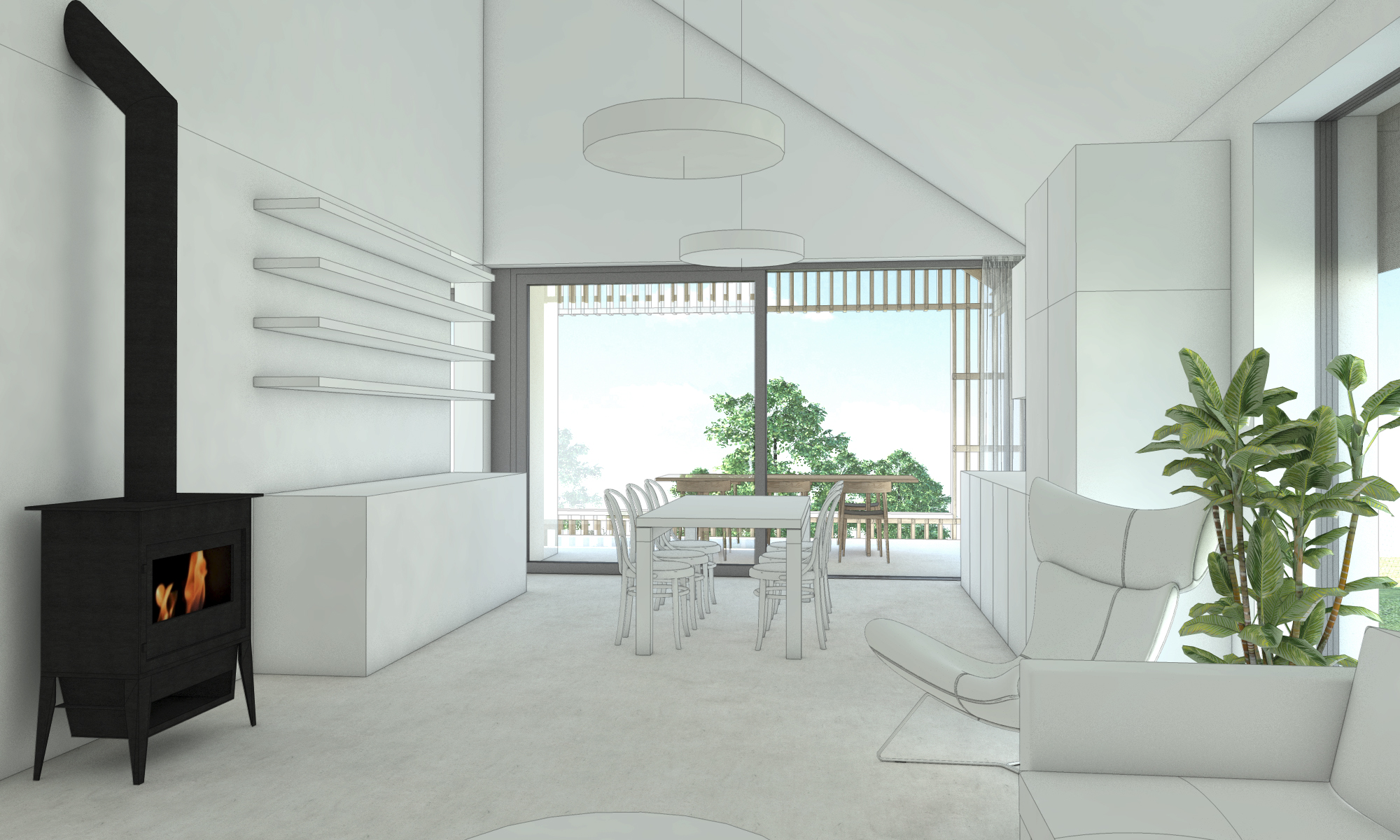 Základnými črtami rodinného domu vrátane úprav okolia sú: ničím nerušený južný výhľad, prepojenie exteriéru s interiérom pomocou zasklených stien, prirodzené tienenie interiéru drevenou štítovou stienkou, prechod okolo domu „suchou nohou“, dostatok denného osvetlenia, jednoduchosť výstavby a komfort bez zbytočne vynaložených prostriedkov.