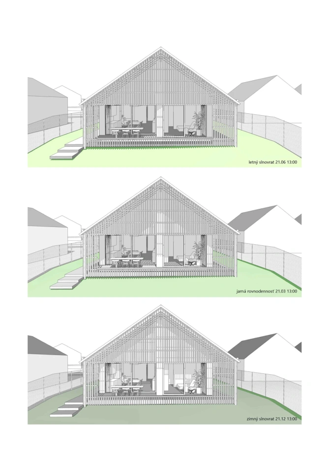 Dom je osadený na podkladovej doske, zvislé konštrukcie sú murované pozdĺž spoločnej a súkromnej časti domu. Súkromná časť má jednoduchý drevený strop a povalu na skladovanie, spoločná časť je otvorená po strechu. Strecha je sedlová, drevená, krov pozostáva len z pomúrnic a krokiev. Niektoré pomúrnce sú oceľové. Presahy strechy sú prispôsobené funkci priľahlých plôch. Východná obytná veranda je riešená s väčším presahom žľabu a západná oslužná komunikácia s menším. Severné závetrie a južná terasa sú prekryté štítovými časťami strechy veľkoryso. Sklon strechy je 35°. Štíty domu tvoria perforované stienky z drevených lát, ktoré sú jeho konceptuálnym architektonickým a svetlotechnickým princípom. V lete chránia interiér pred prehrievaním a v zime nebránia plnohodnotmému preslneniu. Fasády domu sú biele, hladké, krytina vrátane oceľových prvkov a rámov okien je sivá, exteriérové priľahlé podlahy sú navrhované z brúseného betónu. Zápané okná vrátane terasy sú chránené pred prehrievaním screenovými roletami na lankách. Zo severnej strany je umiestnený oceľovo-drevený prístrešok pre dve vozidlá a murovaná dielňa so skladom, extenzívnou vegetačnou strechou a oceľovo-drevenými posuvnými dverami.