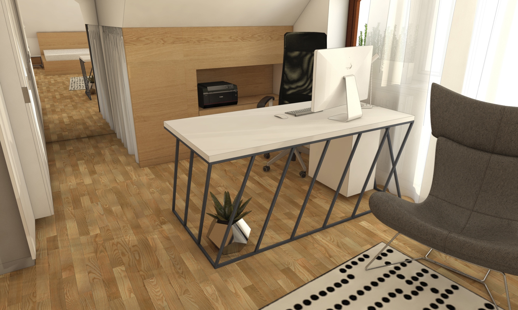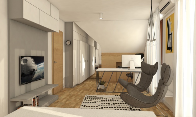 Napriek šikminám strechy, ktoré nám priestor čiastočne orezali a obmedzili jeho zariaditeľnosť, sme dospeli k riešeniu, ktoré vyzdvihuje najviac jeho potenciál. V protiľahlých častiach pod šikminami sa nachádza posteľ a šatník a v strede priestoru zóna pre aktívny relax a posedenie. Pre interiér sme zvolili hlavný materiál s prírodnou drevenou štruktúrou na podlahu, ktorý je skombinovaný s neutrálnymi farbami na zariaďovacích predmetoch.