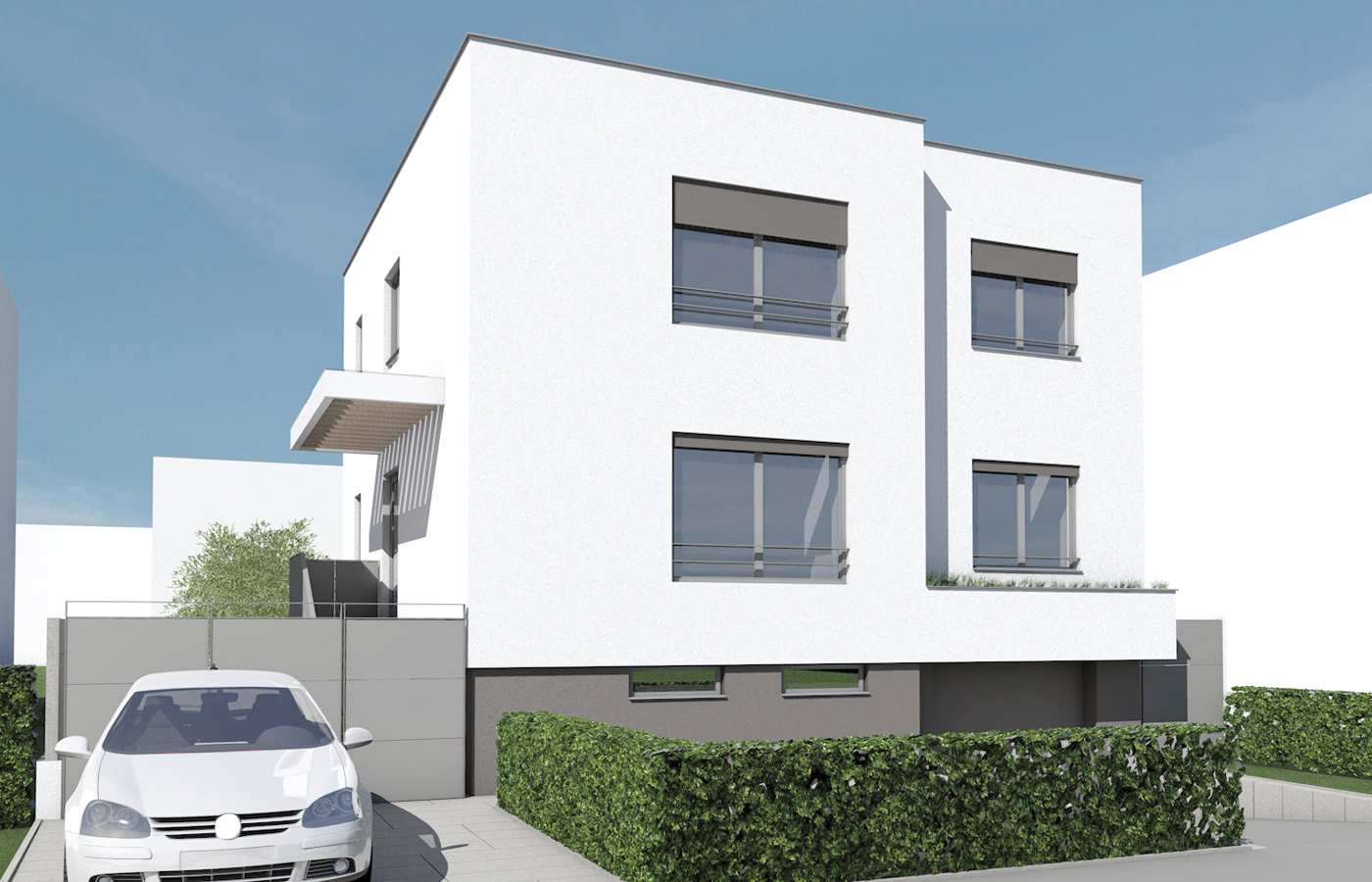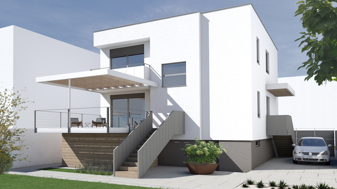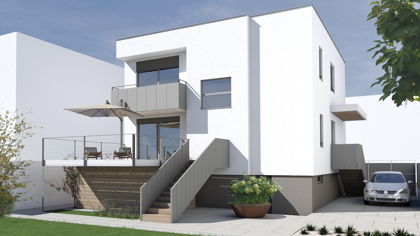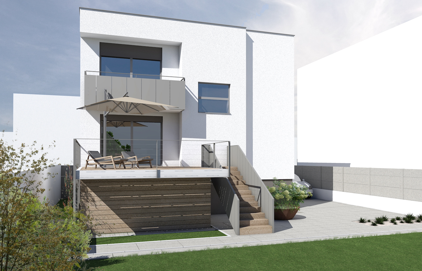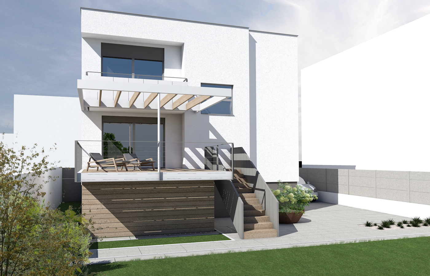 Zredukovali sme množstvo balkónov a použitím ľahkých oceľových doplnkov sme k hlavnému objemu domu pridali rozšírenie terasy a pohodlné schodiská. Samotný objem tiež zmenil tvár úpravami veľkostí okien a pridaním masívnych prístreškov nad garážou a balkónom v záhrade. Pri jedálenskom okne je možné pestovať vonku na strieške bylinky, alebo celú striešku riešiť ako vegetačnú. V záhrade vznikne ľahká oceľová konštrukcia terasy a schodiska, ktorá svojim technickým vzhľadom a ľahkými materiálmi vytvorí príjemný kontrast s hlavným objemom. Moderný vzhľad dopĺňajú textilné rolety, namiesto hliníkových.