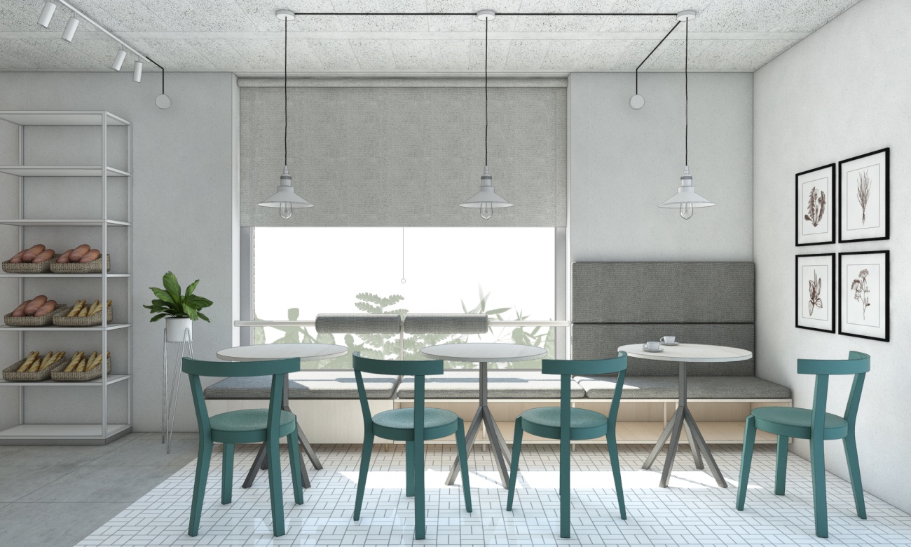 Kombinácia svetlých prvkov: betónová dlažba, lesklá keramická mozaika, buková preglejka, prírodné a kovové doplnky; by spolupôsobením mali vytvoriť optimistickú atmosféru a komfortný priestor pre gastrozážitky z čerstvého chleba, kávy a iných produktov. Rozhodli sme sa pre neopracovaný montovaný strop. Viac prezrádzajú obrázky.