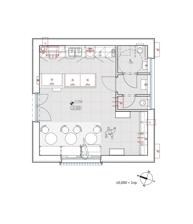 Dispozícia drobnej prevádzky je racionálna. Výkladom interiéru je lavica na sedenie, teda samotný zákazník, oproti stojí predajný pult a miesto pre prípravu, predajný kútik s regálmi poskytuje čiastočne izolovaný priestor na nákup produktov, nechýba bezbariérové wc. Miesta na sedenie pri lavici sú podčiarknuté mierne kontrastnou dlažbou.