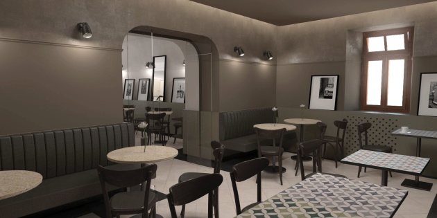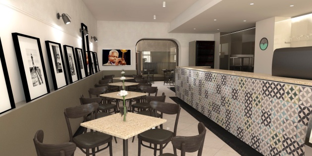 Priestor sa delí na nefajčiarsku miestnosť s pultom a fajčiarsky salónik. Návrh redizajnu počíta s úplnou zmenou tváre miestností. Pre polohu cukrárne priamo v historickom centre mesta sme zvolili klasický charakter, na ktorom sa podieľa hlavne pult. Je obložený ručne maľovaným cementovým obkladom s geometrickým vzorom v rôznych farbách. Horná doska pulta je pôvodná. Ostané povrchy a prvky sme prispôsobili farebnej schéme z dvoch kontrastných farieb: čokoládová a krémová (vanilková).