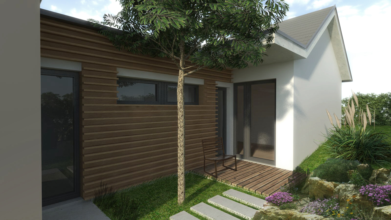 Na pozemku nebude rodinný dom stáť sám, ale spolu s ďalším domom. Ten druhý bude mať osadenie štandardné, v náväznosti na príjazdovú cestu. A tento bude umiestnený atypicky, v zadnej časti záhrady. Hlavnou ideou domu bolo proporciami a mierkou nekonkurovať okolitej zástavbe, citlivo využiť prirodzený terén a spolu s ďalším domom na pozemku dodržať limity pre zastavanie. Ďalej ako vždy, navrhnúť dom šitý na mieru mladému a sympatickému páru.