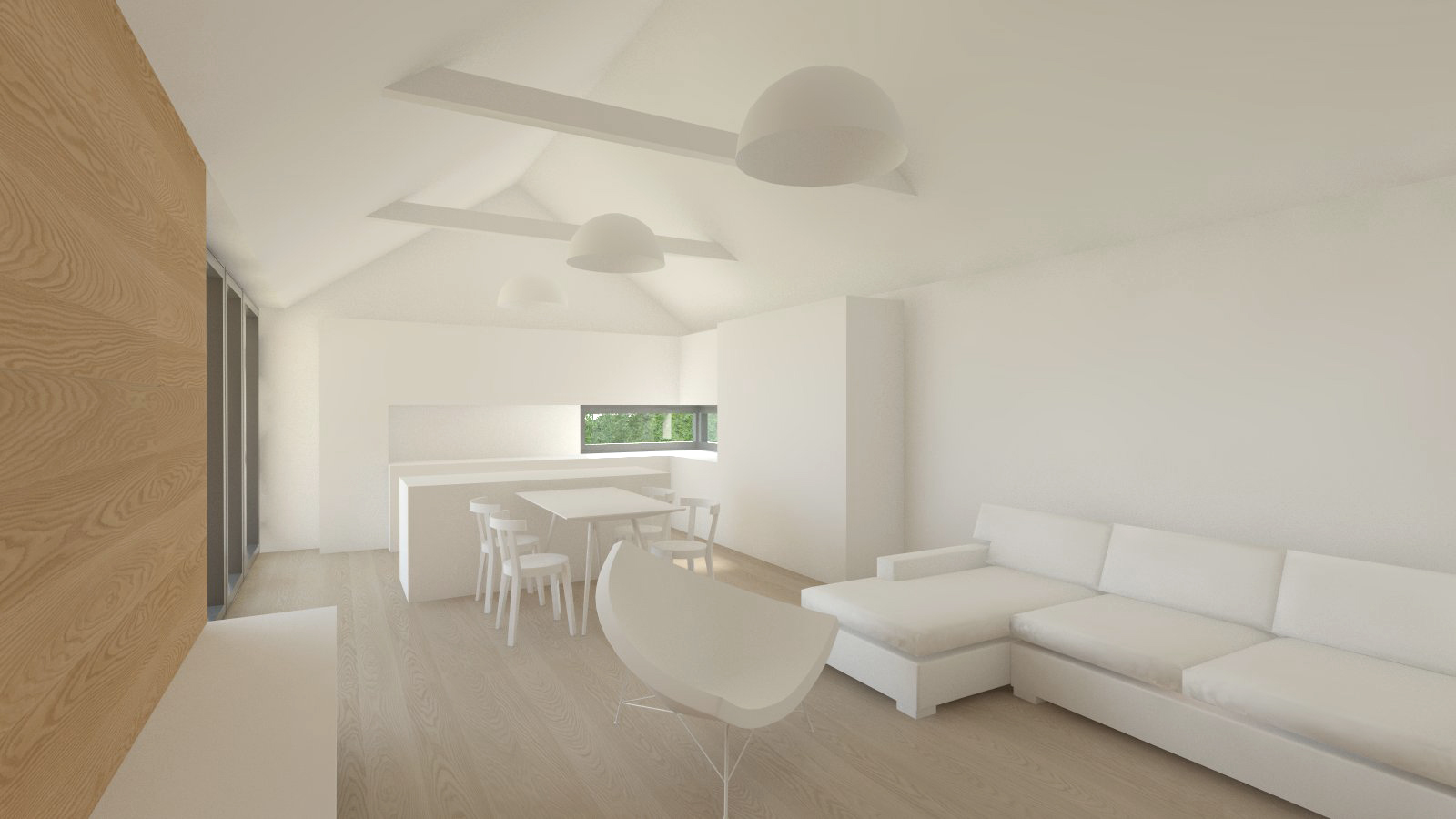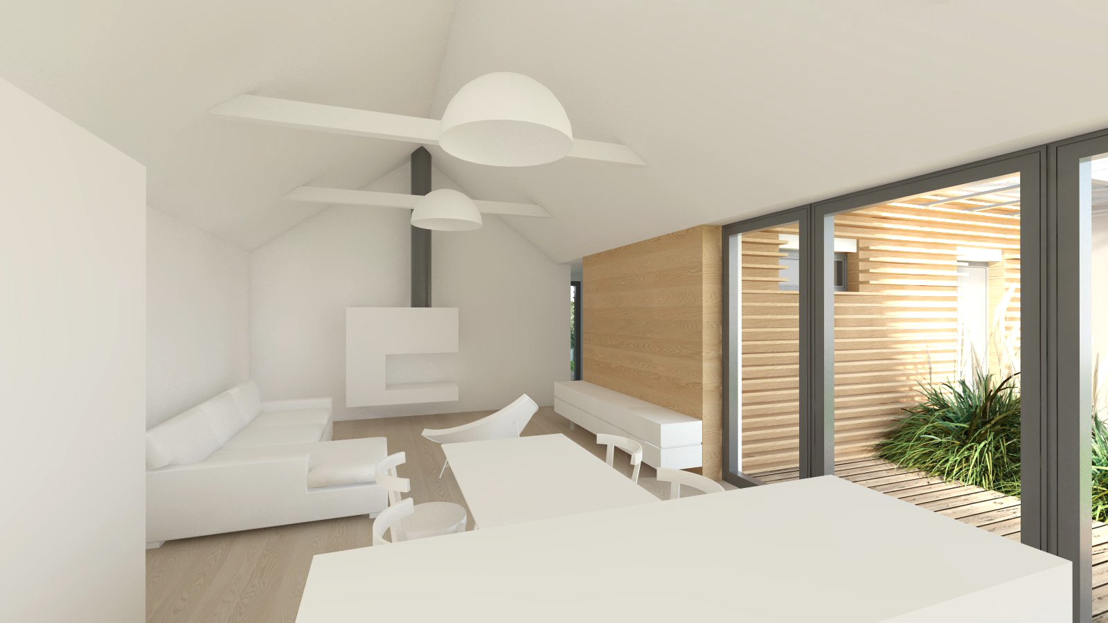 Dom má spolu 4 obytné miestnosti. Každá z nich má výhľad úplne odlišný od tých ostatných. Spoločenská časť je orientovaná tak, aby bolo zabezpečené súkromie obyvateľov oboch domov na pozemku a dostatočné preslnenie, to je smerom na bok pozemku, juhovýchodná strana. Detské izby sú orientované opačnými smermi, na juhozápad a severovýchod. Spálňa zachytáva ranné lúče slnka vďaka polotvorenému atriu, ktoré ju opticky aj funkčne rozširuje von do exteriéru.