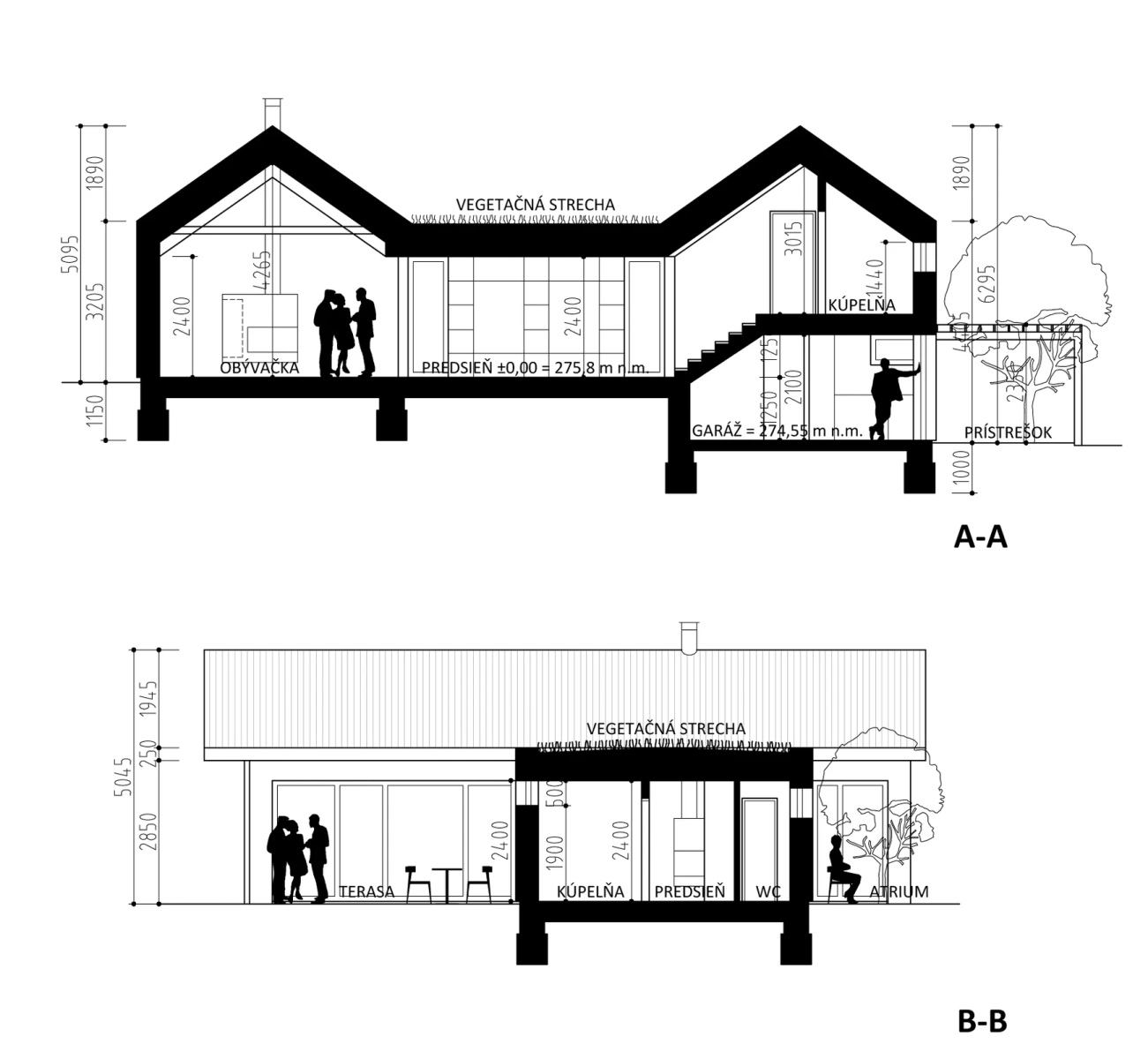 Pre citlivé využitie svahu na pozemku bolo snahou rozčleniť dom na výškové úrovne. Tak vznikli tri podlažia domu, výškovo osadené po 1,25 metra. Prvé dve z nich sú prístupné bezbariérovo priamo z terénu. Prvé podlažie je určené pre skladovanie, techniku a garáž, druhé tvorí spoločenská časť domu so spálňou a príslušenstvom a tretie slúži deťom alebo hosťom.